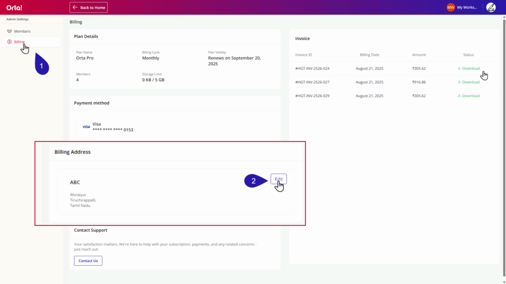 Orta makes updating the billing address simple. To change or edit the address, follow these steps: