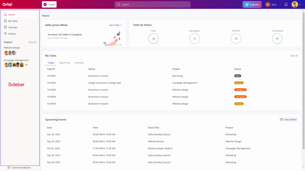 Sidebar in Orta features essential menus to kickstart your day including options for Project Management, Task Management, Task Management, Event Management, and more.